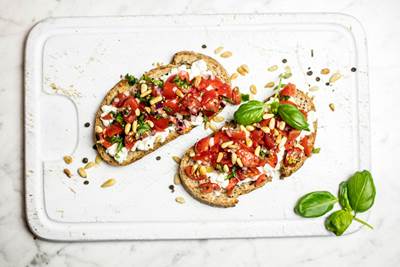Velg variert pålegg som leverpostei, makrell i tomat, skinke og ost og «sett farge» med frukt og grønnsaker som avokado, tomat, paprika, eple, banan, kiwi og appelsinskiver. Det er fristende, kjempegodt og sunt på en gang!