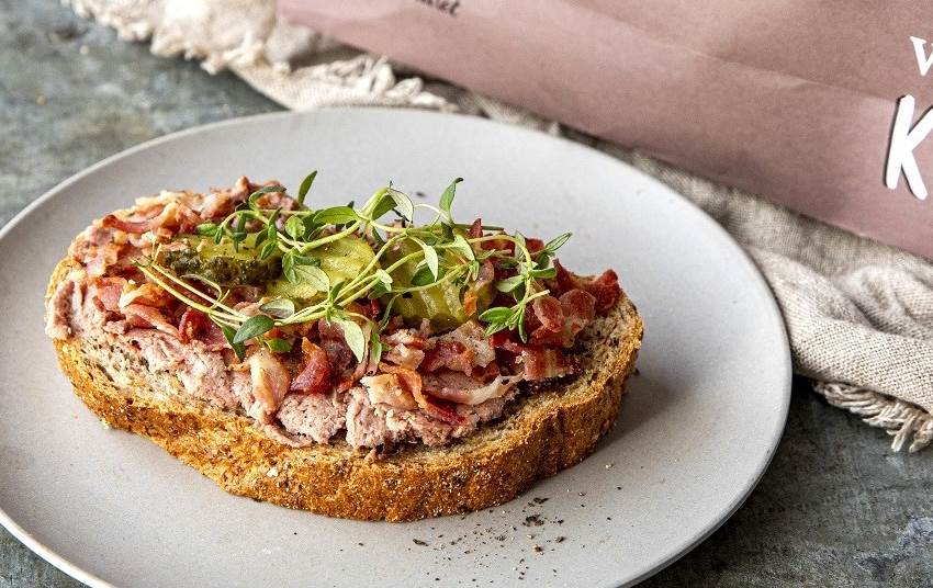 Kornbrødskive med leverpostei og bacon