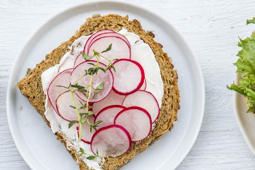 - Topp med reddik skjært i skiver og de urtene du liker best.