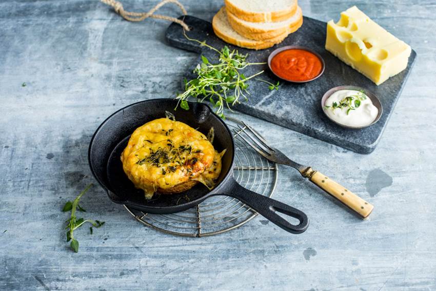 2. Topp med gode skiver Jarlsberg eller annen gulost og legg på en liten kvast timian for smakens skyld.