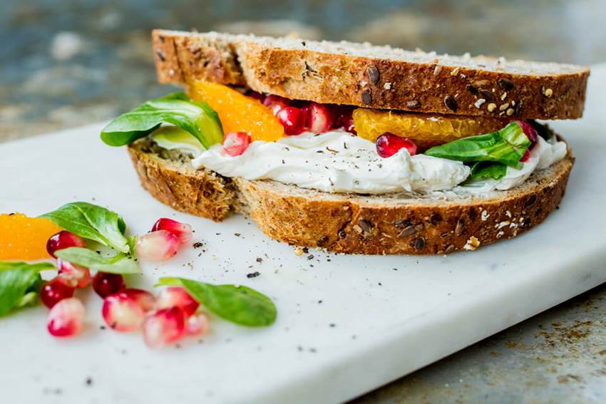 - Legg mozzarella, appelsinbåter, noen granateplekjerner og salat på den ene brødskiven. Til slutt legger du brødskivene sammen.
