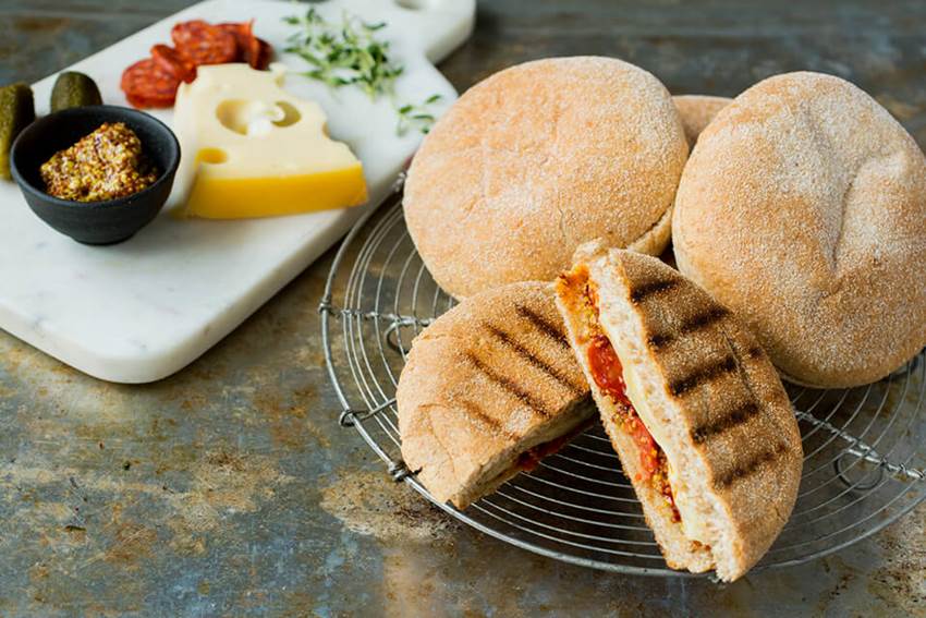 - Smør sennep på burgerbrødet, skjær chorizo i skiver og legg dem på burgerbrødet. Topp med sylteagurk, skivet ost og legg toppen på.