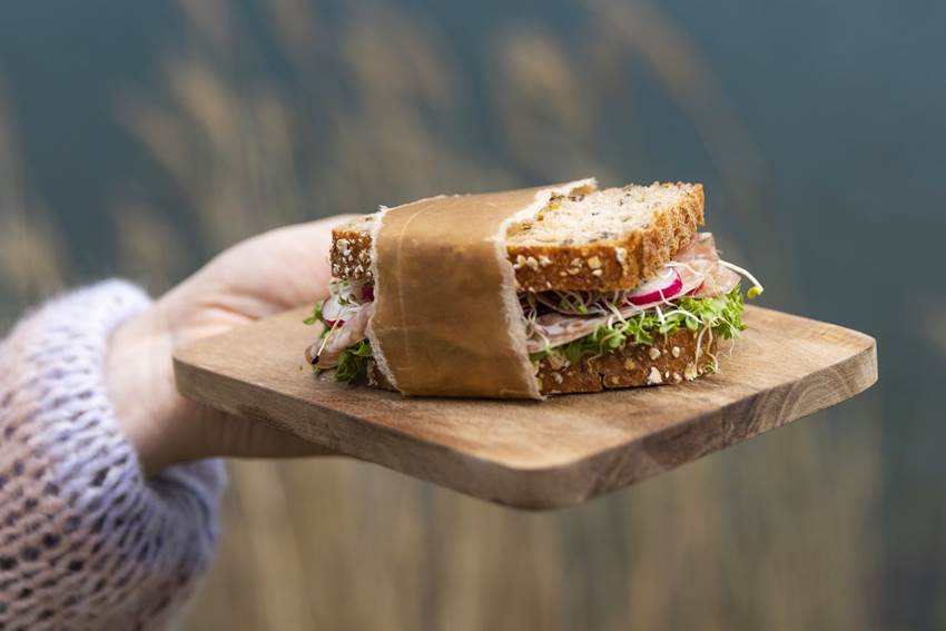 - Legg salat på den ene skiven, fortsett med salami og tynne skiver reddik.