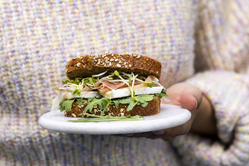 - Start med ruccola og topp med skiver av brie, spekeskinke og spirer.