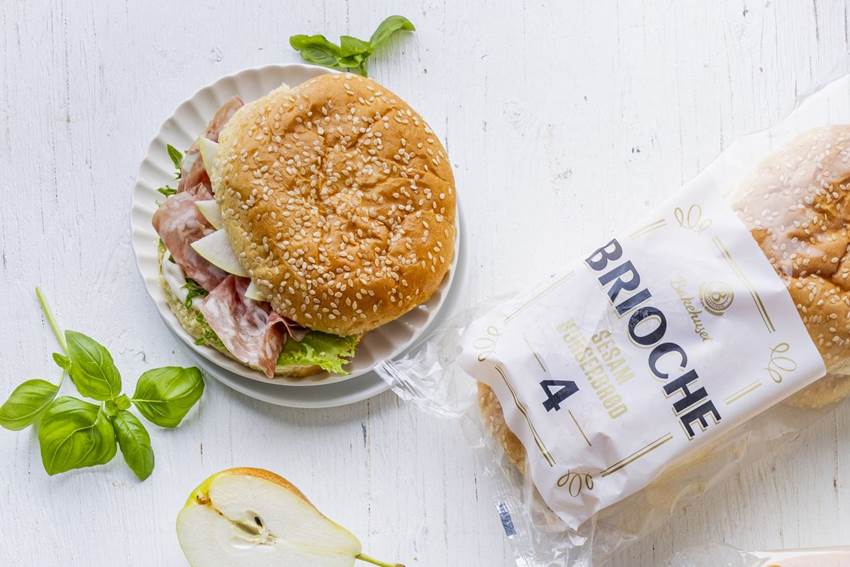 Server Brioche sesam burgerbrød med tynne skiver salami, frisk