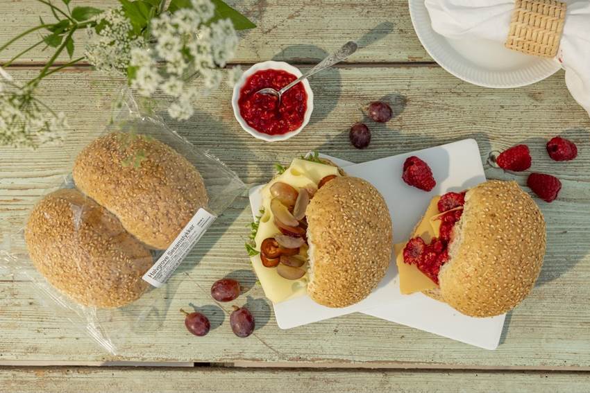 - Del sesamstykkene i to og server med gulost og druer eller brunost og hjemmelaget bringebærsyltetøy.
