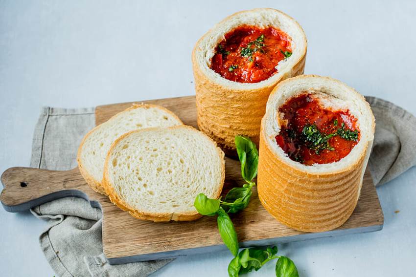 - Skjær en spiralloff i to og ta ut innmaten. Sett spiralloffen med åpningen opp og hell deretter tomatsuppen oppi.