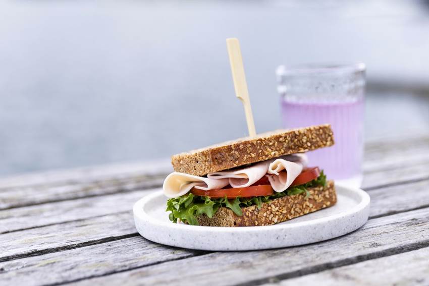 - Legg salat på den ene skiven, fortsett med skinke og tomatskiver.