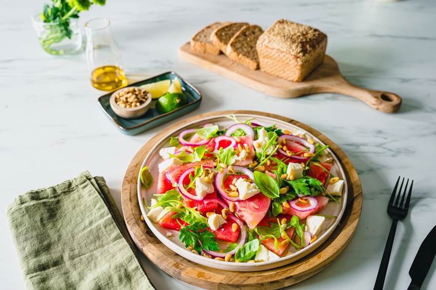 Sommer er høysesong for salater, og denne friske vannmelon- og fetasalaten er deilig frisk på varme sommerdagen. Smaker ypperlig med skiver av speltbrød ved siden av.