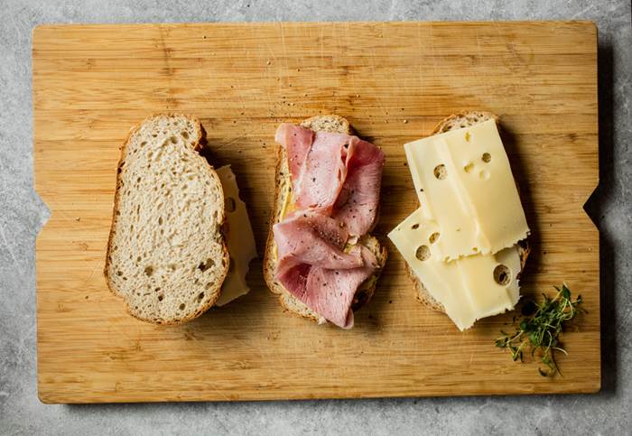 - Legg et par osteskiver og skinke på halvparten av alle brødskivene.