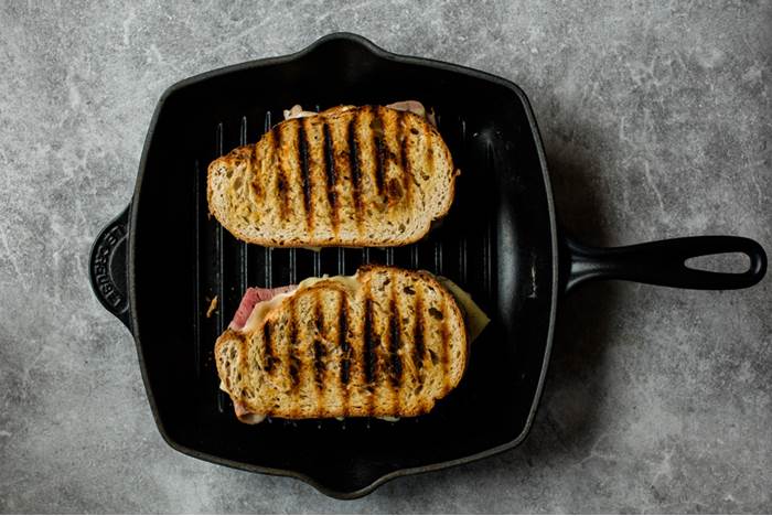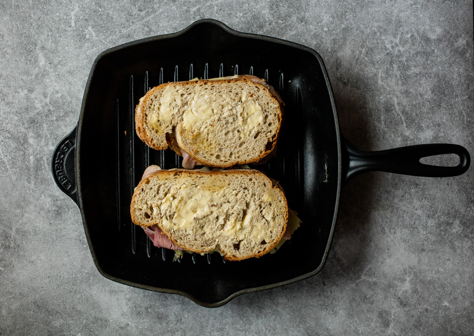 - Stek ostesmørbrødene på middels varme i cirka 2–3 minutter på hver side.