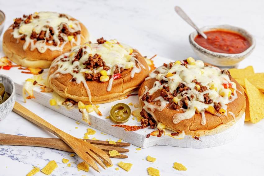 - Fyll brødet med tacoblandingen og topp med mais og en håndfull revet ost.