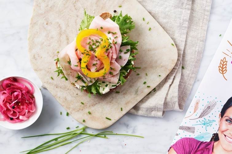 - Topp skivene med paprika og finsnittet gressløk for smaken skyld.