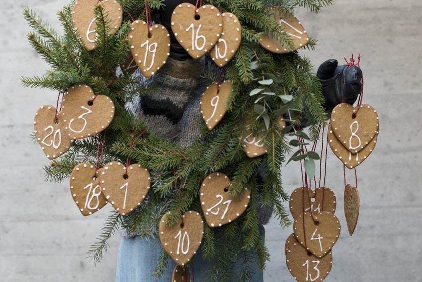 - Stikk ut pepperkakedeigen med hjerteformer. Lag hull i hjertene før steking slik at du kan feste pepperkakene til kransen - med tråd. Dekorer alle hjertene med melis i tallene 1 - 24.