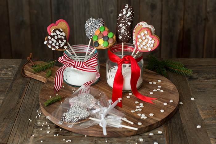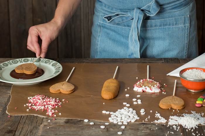 - Stikk ut hjerter av pepperkakedeig, legg to og to sammen med en pinne imellom før steking.