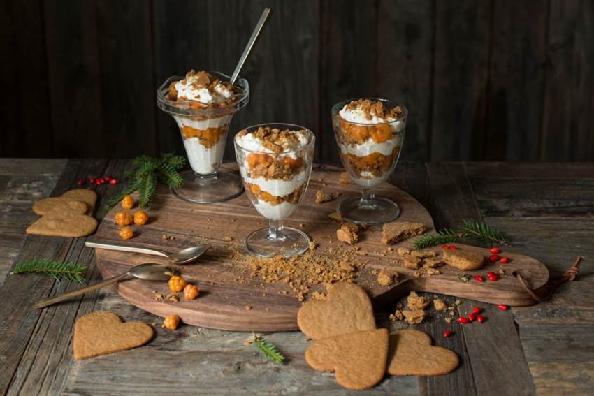 Dekk pepperkakebitene i hvert glass med et par store spiseskjeer krem og multer i lag. Multer kan også erstattes av andre bær, bringebær eller blåbær.