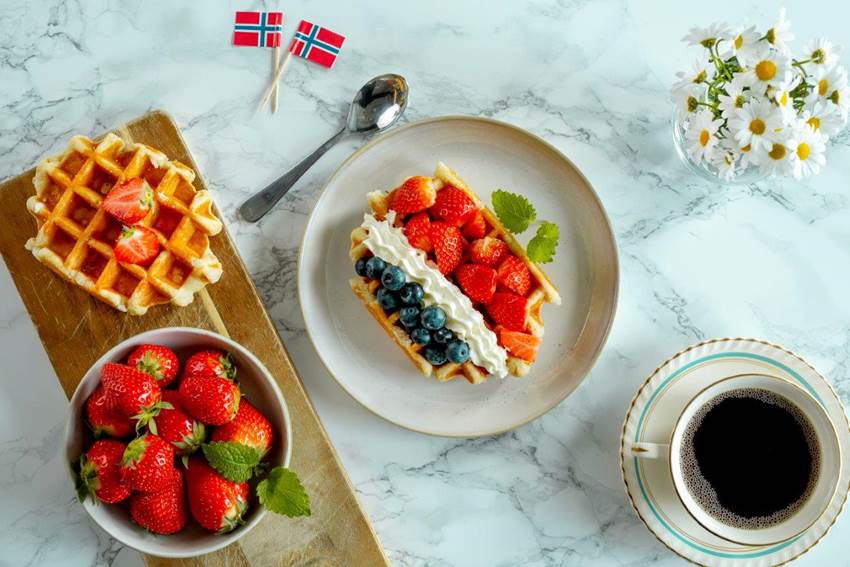 - Fordel jordbær, kremfløte eller yoghurt, og blåbær i striper på vaflene.