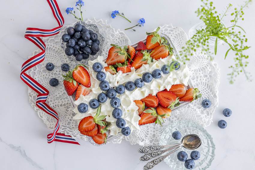 - Skyll jordbær og blåbær. Del gjerne jordbærene i mindre biter, før du legger dem i firkanter i hvert hjørne på kaken. Blåbærene legges i en stripe på midten av kremen.