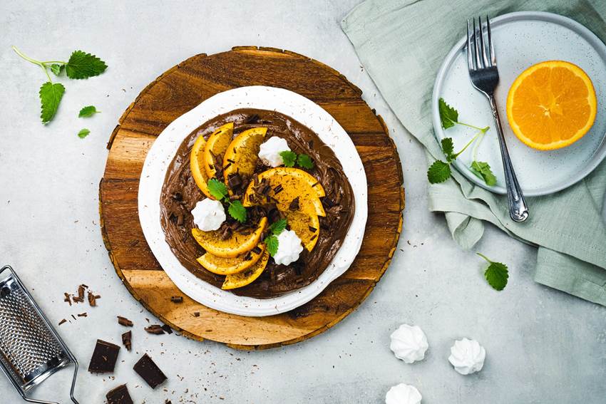 - Del appelsinen i tynne halve skiver, og riv over litt sjokolade. Pynt med marengstopper og sitronmelisse.