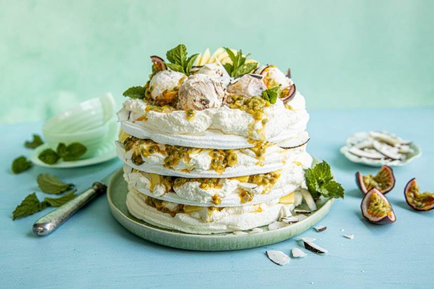 - Legg på en marengsbunn til og fortsett til du har lagt is, krem, mango og pasjonsfrukt på alle fire marengsbunner. Pynt med ekstra kokos-is og litt mynte på toppen.