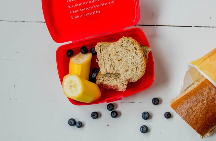 Del en banan i to og ha i matpakken sammen med litt bær og skiver av Julius Favorittbrød. En rask og enkel matpakke til barna.