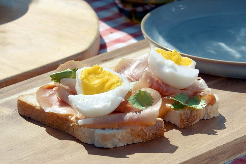 - Smør blandingen på en brødskive og topp med spekeskinke, egg og litt olivenolje