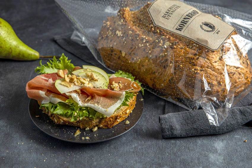 Bakerens Utvalgte Kornbrød er et saftig og smaksrikt brød med mye frø og korn. Spekeskinke smaker godt på skivene av dette brødet.