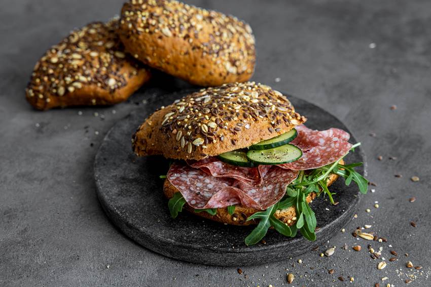 Bakerens Utvalgte Kornstykke er et saftig, smaksriktig og halvgrovt (35% grovt) rundstykke med mye frø og korn. Smaker ypperlig med salami og ruccola!