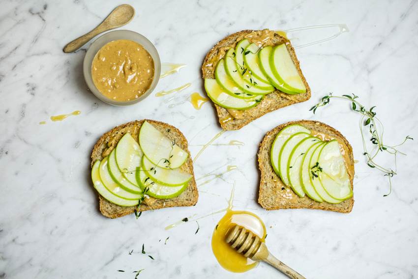- Skjær et eple i tynne skiver og legg epleskivene på brødskiven.