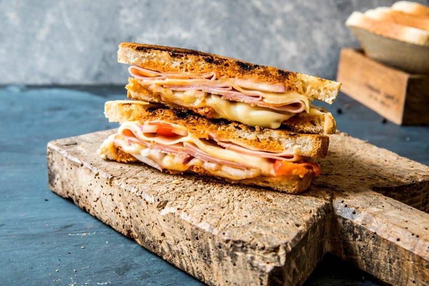 - Legg på skinke og skiver av Norvegia.