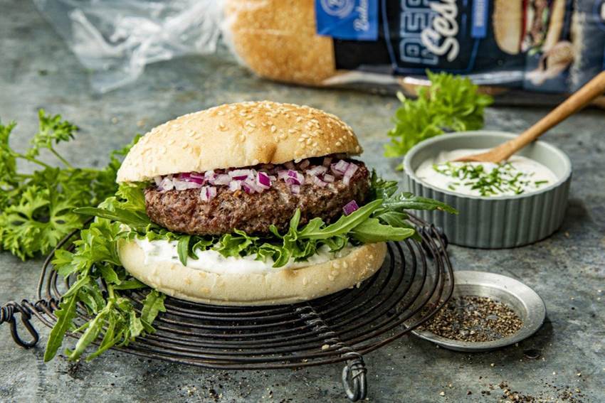 - Start med dressingen, fortsett med frisk salat, grillet burger og topp med finhakket løk og enda mer dressing.